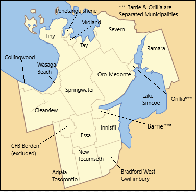South Simcoe municipalities are situated at the northern boundary of the Greater Toronto Area (GTA) and therefore generally have a closer socio-economic association with the GTA. South Simcoe is also within the Toronto commuter belt as it is home to a relatively high proportion of people commuting to the GTA. South Simcoe is home to five municipalities, including: the Town of Innisfil, the Township of Adjala-Tosorontio, the Town of Bradford West Gwillimbury, the Township of Essa and the Town of New Tecumseth (which includes: Alliston, Beeton and Tottenham).